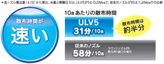 ラウンドアップマックスロード専用として新開発された《ラウンドノズルULV5》により、通常50L〜100L/10aの散布水量での散布が、わずか5Lの水量で散布が可能となります。散布液の軽量や希釈水を準備する時間が大幅に減少します。